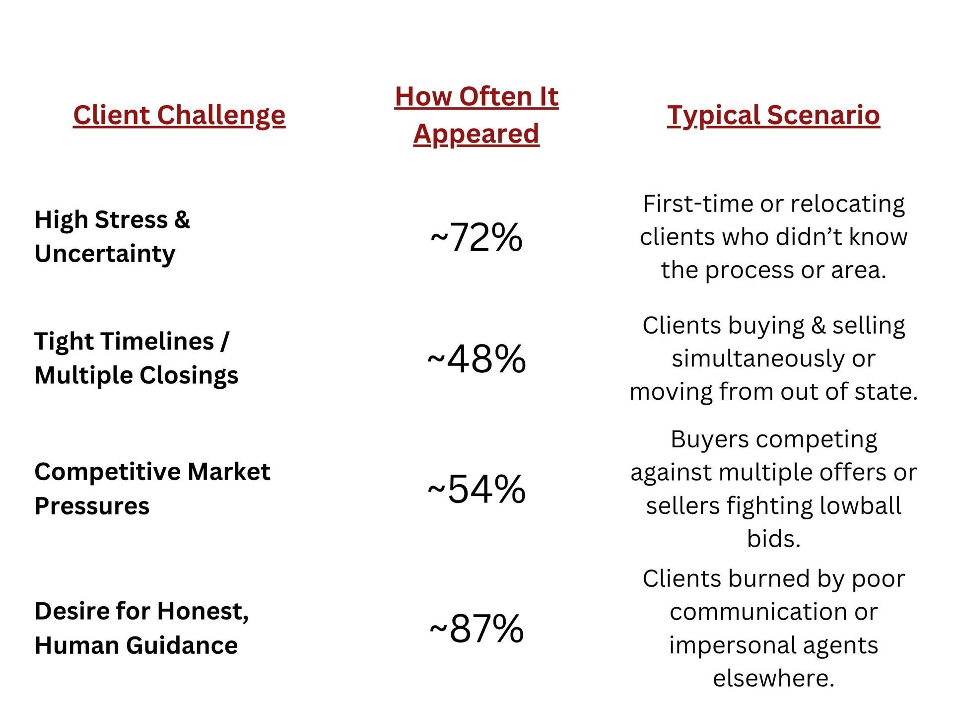 Analyzing over 60 detailed testimonials, four main challenges consistently appeared:
