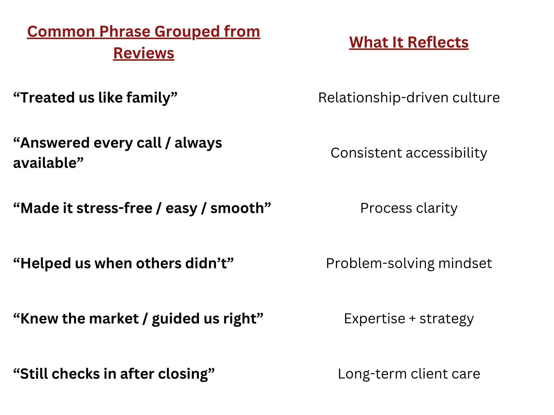From dozens of first-person reviews, we distilled CCRG’s differentiators into four core behaviors that repeatedly surface: