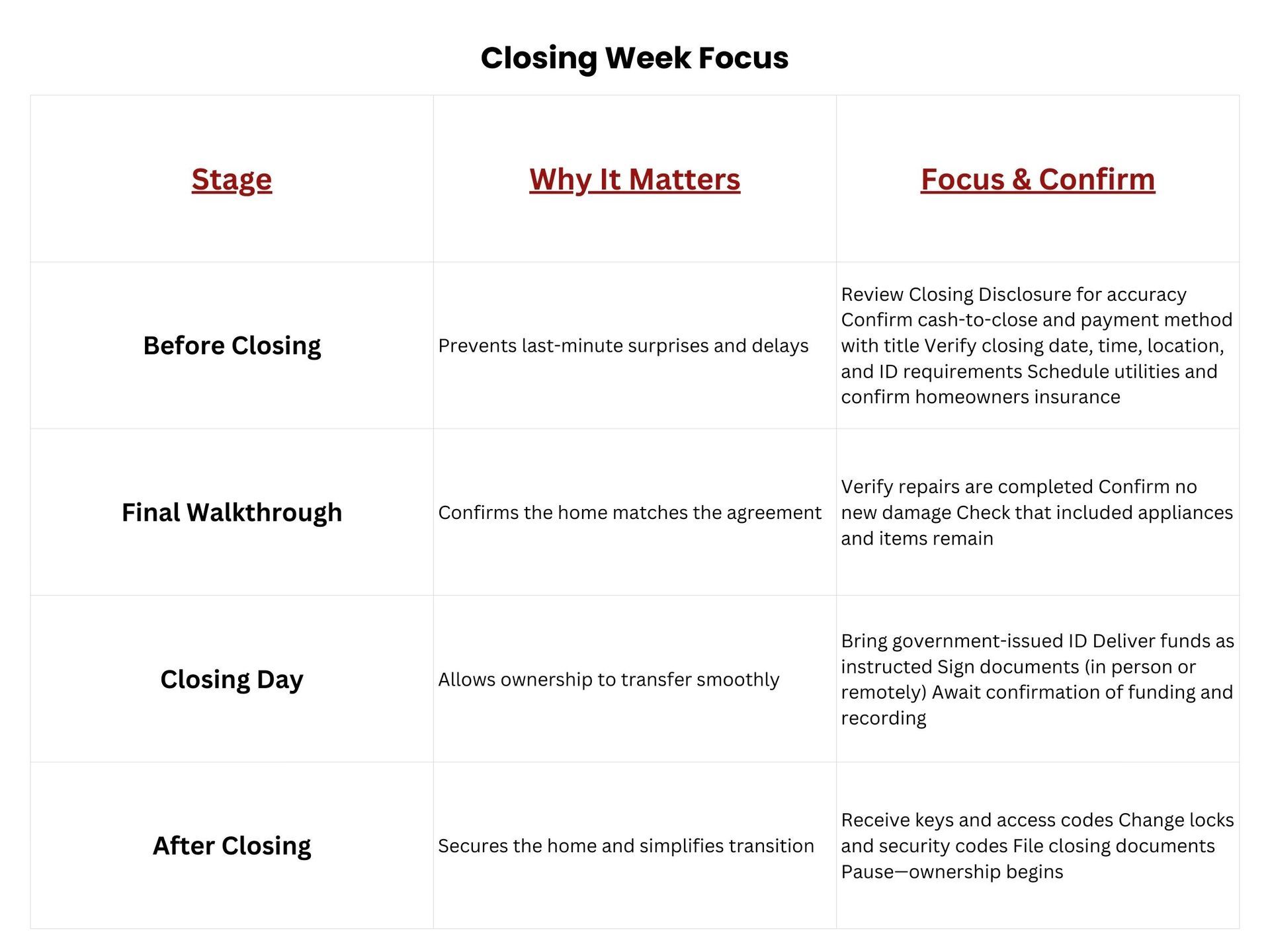 Closing week works best when buyers slow down, take things one step at a time, and lean on structure instead of adrenaline.