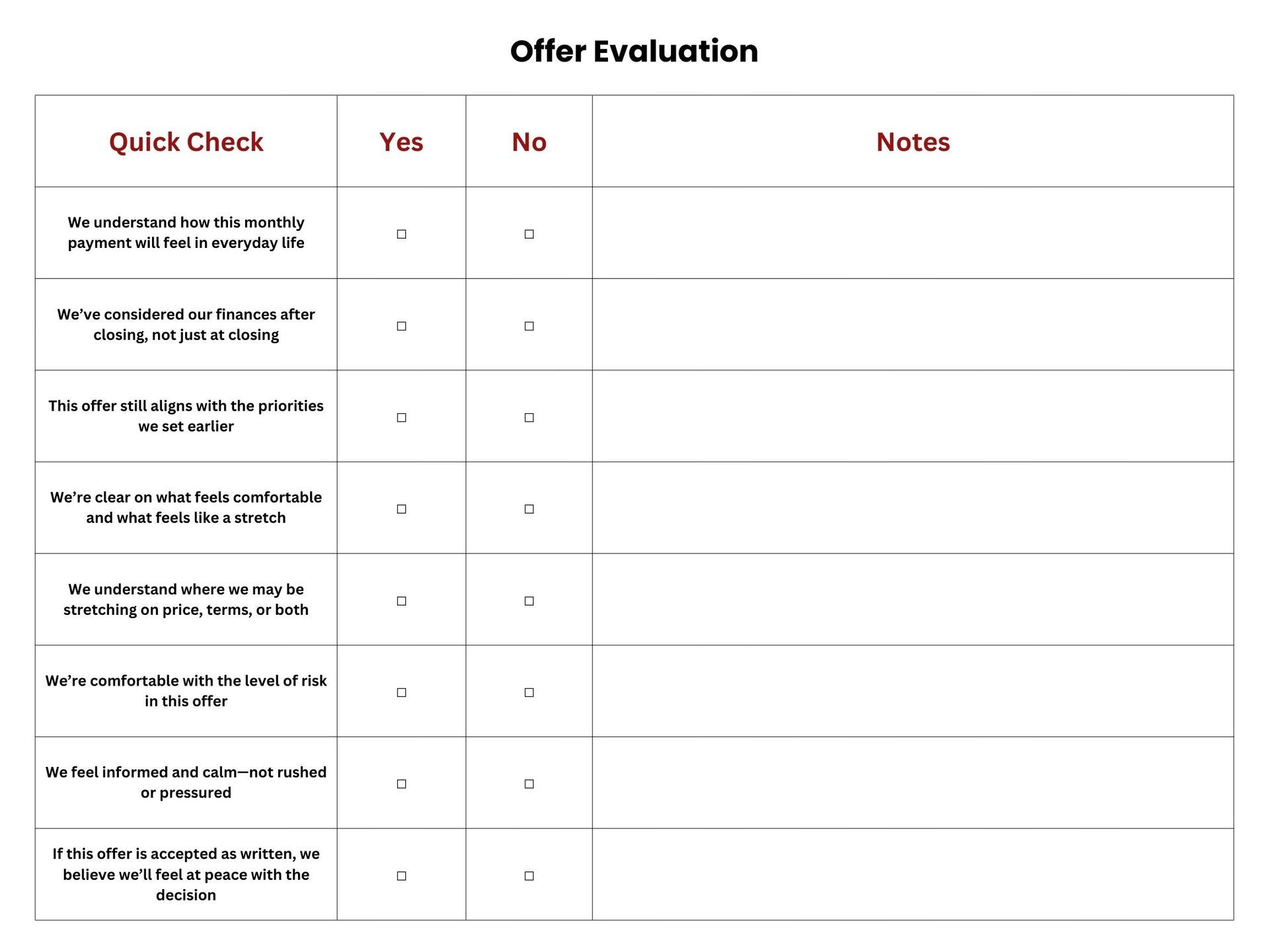 Before finalizing an offer, revisit the monthly comfort range you defined earlier. If the payment stretches beyond what felt sustainable then, it will feel heavier later—after closing costs, maintenance, utilities, and everyday life settle in.